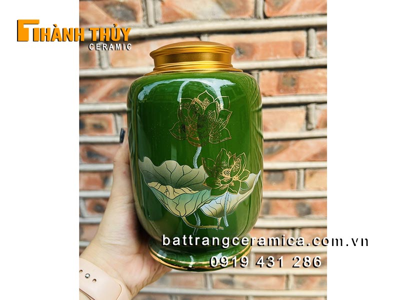 Bình đựng trà thảo luận , hũ đựng trà bằng gốm sứ Bát Tràng được hoàn thiện tỷ mỷ giá rẻ , công phu kho hàng , họa tiết hoa sen trên thân hũ trà được vẽ tinh tế và nổi bật.